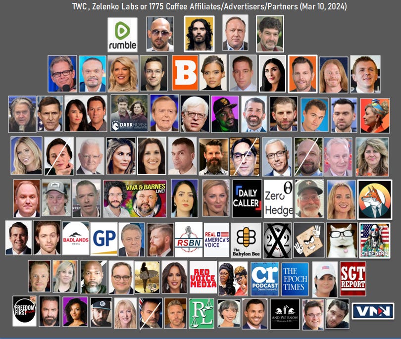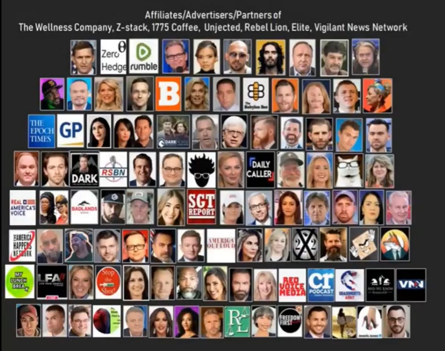 Row 3 Steve Bannon; Mike Flynn; Clayton and Natali Morris; Brett Weinstein and Heather Heying; ?; ?; Lou Dobbs; Dennis Prager; Zuby; Donald Trump Jr.; Eric Trump; Charlie Kirk of Turning Point; Jack Posobiec; Rosanne Barr