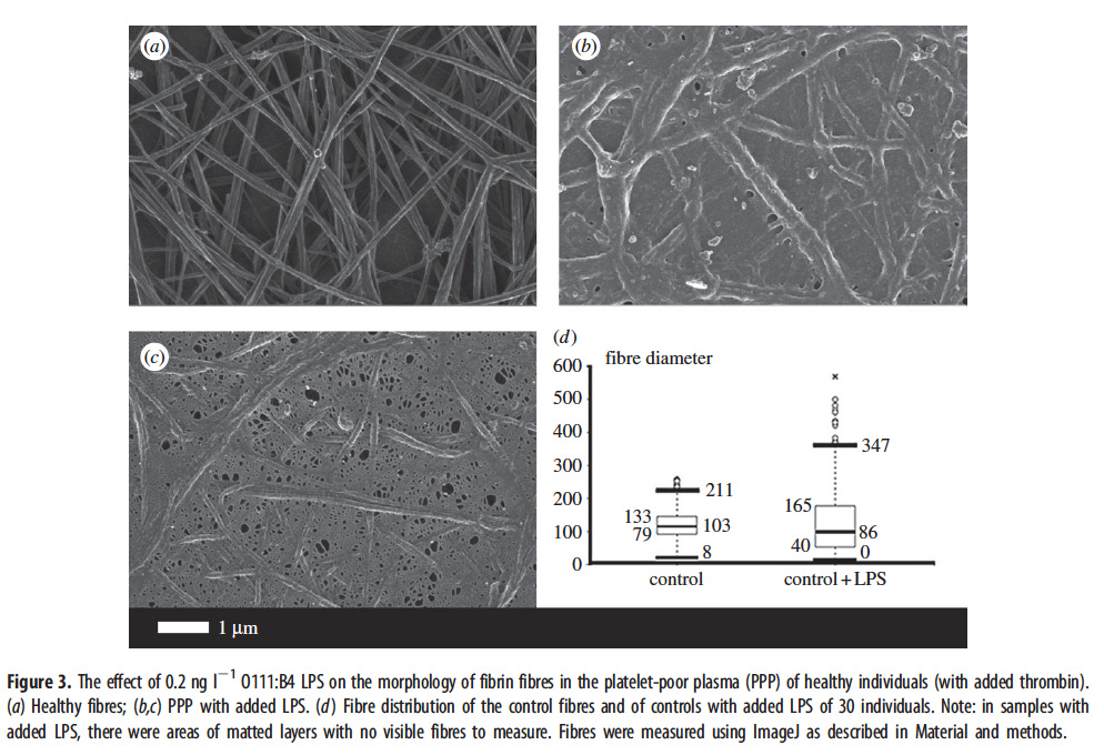 Here, we show that the addition of tiny concentrations (0.2 ng l−1) of bacterial LPS to both whole blood and platelet-poor plasma of normal, healthy donors leads to marked changes in the nature of the fibrin fibres so formed, as observed by ultrastructural and fluorescence microscopy (the latter implying that the fibrin is actually in an amyloid β-sheet-rich form that on stoichiometric grounds must occur autocatalytically).