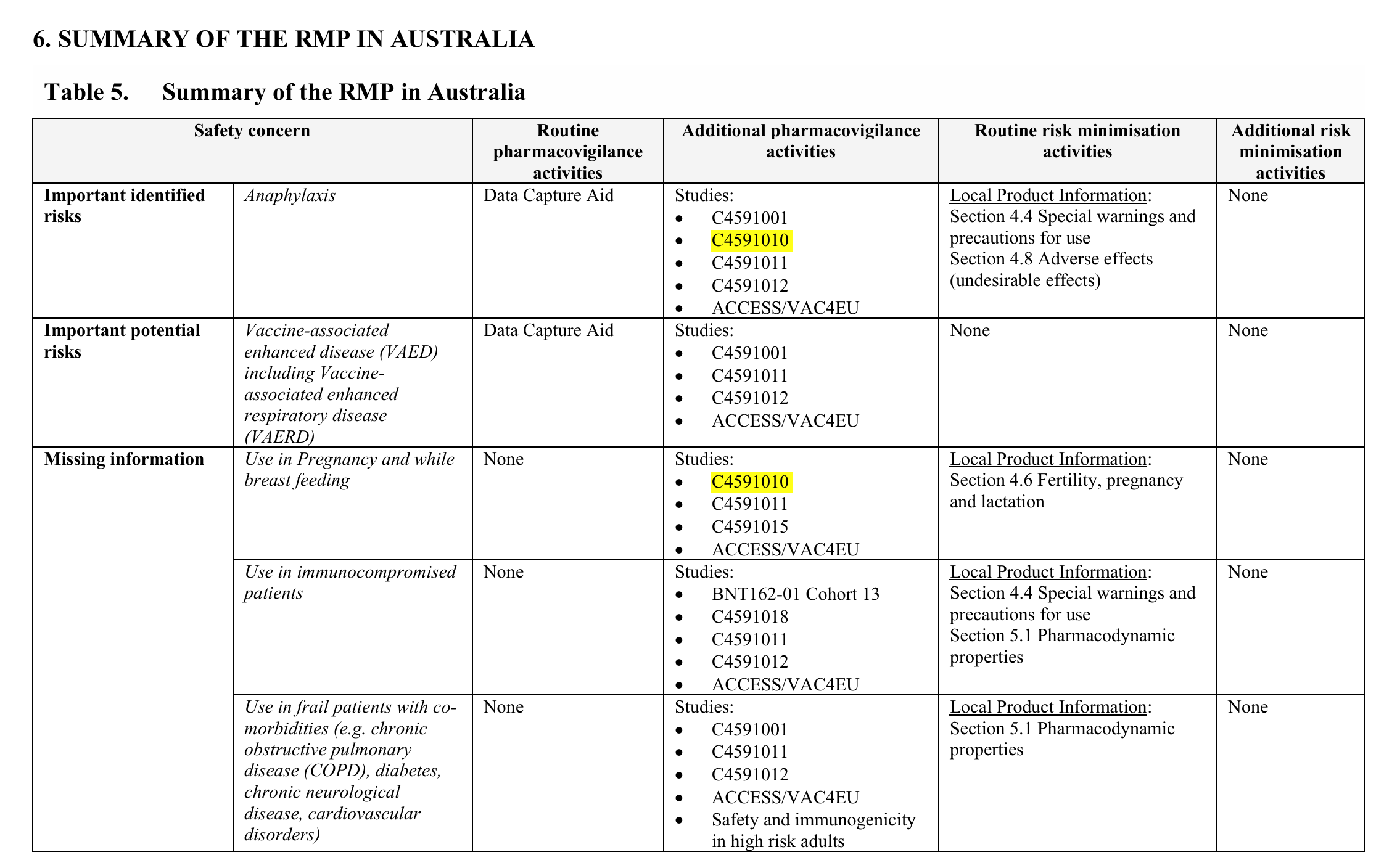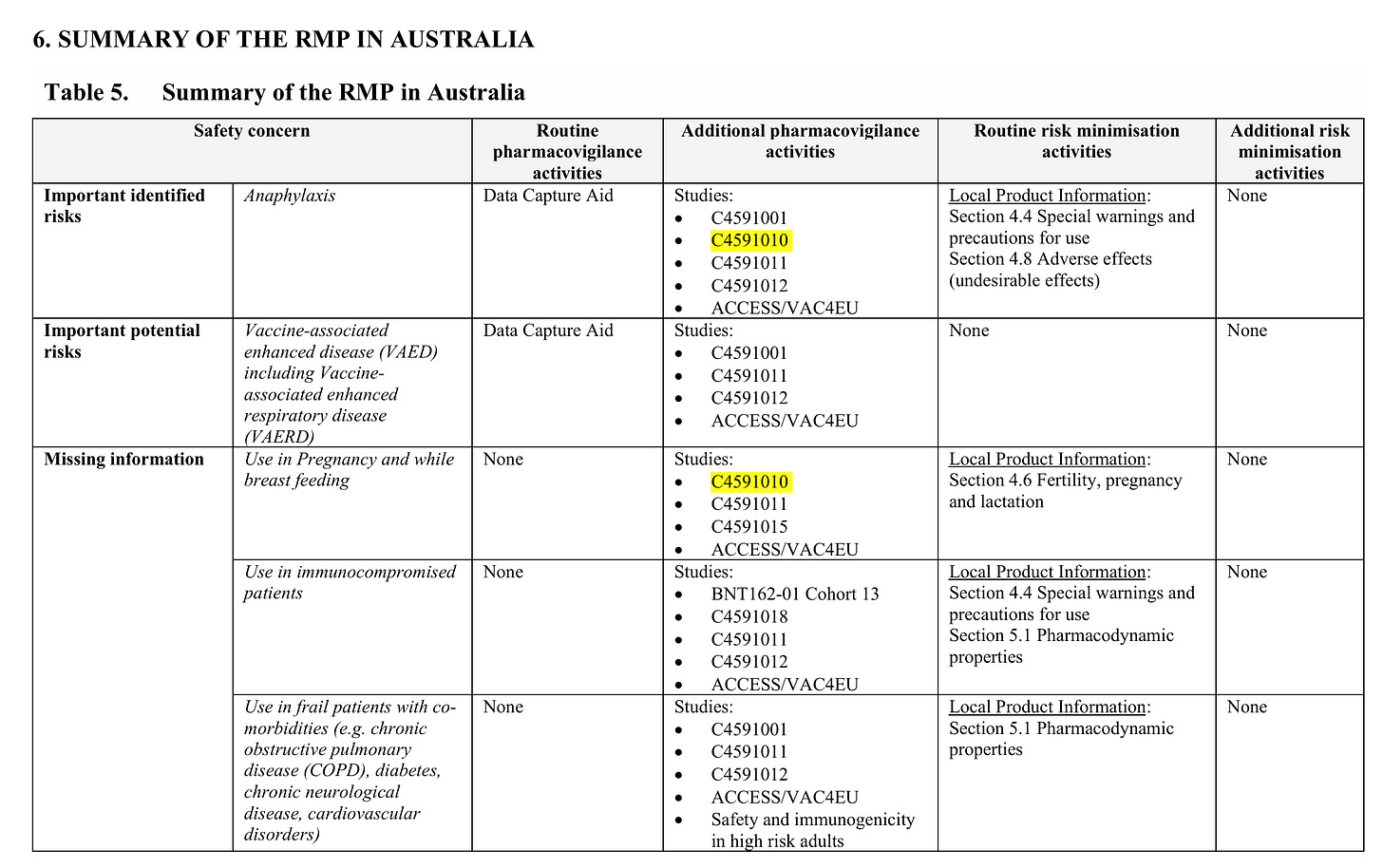 Bine has highlighted the fact that Australia is involved in this Table 5 from the Risk Management Plan (RMP).